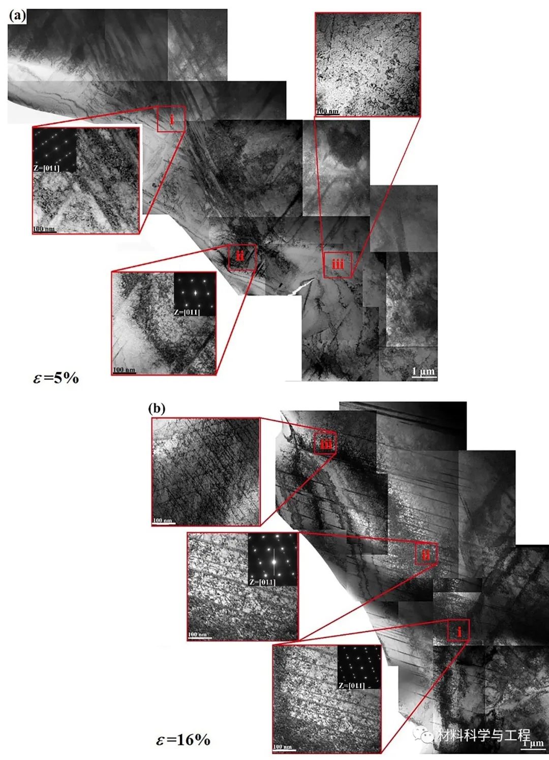 图5.四次LSP处理后HEA合金在不同拉伸应变(e)后样品表层的TEM:(a)e=5%,(b)e=16%