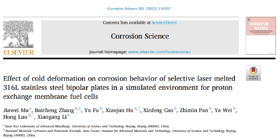 基于此,北京科技大学钢铁冶金新技术国家重点实验室和新材料技术研究院采用扫描电子显微镜(SEM)、X射线衍射(XRD)、透射电子显微镜(TEM)、能谱仪(EDS)和电子背散射衍射仪(EBSD)对不同变形程度的SLMed 316L不锈钢的微观结构进行了表征。通过动电位极化、电化学阻抗谱(EIS)和Mott-Schottky研究了钝化膜的腐蚀行为和半导体特性。用X射线光电子能谱(XPS)对钝化膜的组成进行了定性研究。最后,从薄膜的角度讨论了亚晶界、孪晶界和位错对SLMed 316L不锈钢腐蚀行为的影响。相关研究结果以题“Effect of cold deformation on corrosion behavior of selective laser melted 316L stainless steel bipolar plates in a simulated environment for proton exchange membrane fuel cells ”发表在腐蚀顶刊《Corrsion Science》上。