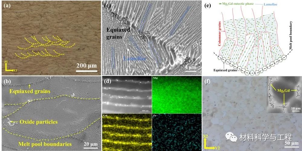 Mg-Gd系镁稀土合金通常要先在高温下固溶热处理,再低温下人工时效处理才能获得足够的强度,本文通过激光粉末床熔融(laser powderbed fusion, LPBF)金属增材制造技术直接制备了强塑性匹配的Mg-10Gd-0.2Zr镁稀土合金。优异的强塑性匹配来源于打印态Mg-10Gd-0.2Zr合金的多尺度分级显微组织:异质晶粒结构、晶内的层片状亚结构和纳米尺寸的析出相。此外,首次在打印态Mg-10Gd-0.2Zr合金中发现了大量晶内的块状β1相的反常析出。上述研究结果表明LPBF过程独特的热和应变历史可用来选择性调控析出相的种类、面积数密度、形貌和分布,从而调控力学性能。