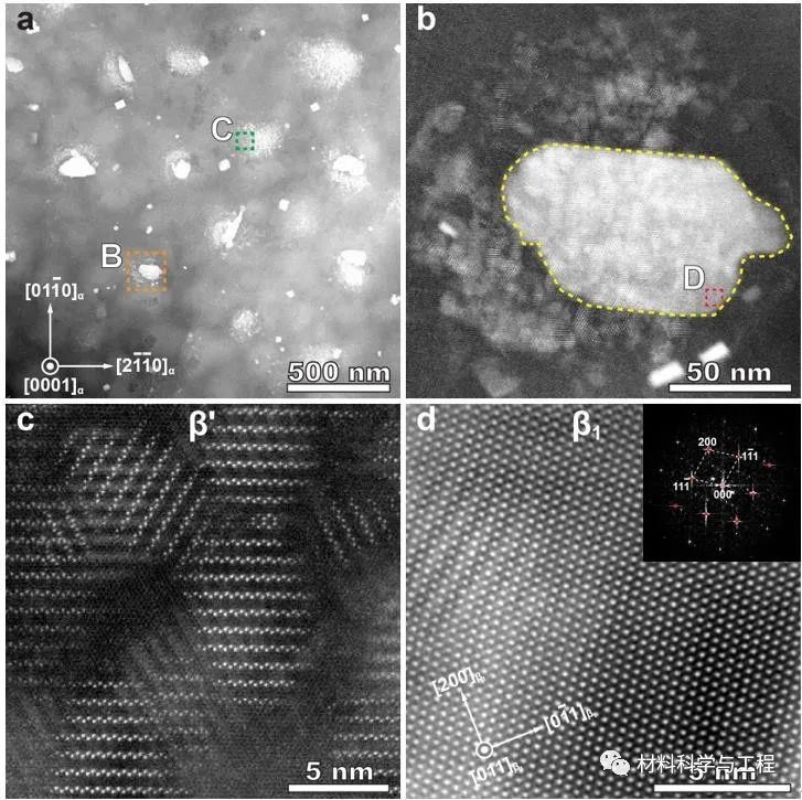 打印态G10K合金中存在大量的晶内析出相,较大的块状β1相和小的透镜状β′相聚集分布,β1相的形貌和分布都显著区别于传统峰时效态Mg-Gd合金(菱形,连接两个β′相)。打印态G10K合金中很有可能是先析出较大的β1相,再在β1相周围析出大量细小的β′相。
