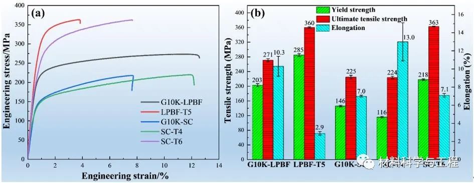 LPBF过程快速凝固导致打印态G10K合金中共晶相较少,可直接进行时效热处理。和铸造-T6态相比,打印态G10K合金拉伸强度低但是塑性更好,LPBF-T5态屈服强度更高,抗拉强度相当但是塑性更差。
