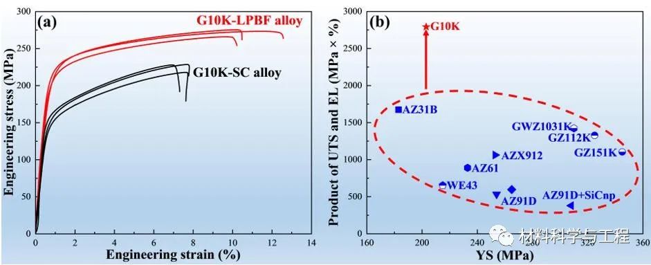 强塑积和材料的韧性(应力应变曲线的积分面积)正相关,更高的强塑积代表更高的韧性,打印态G10K合金和其他打印态镁合金相比具有显著更优异的强塑性匹配。