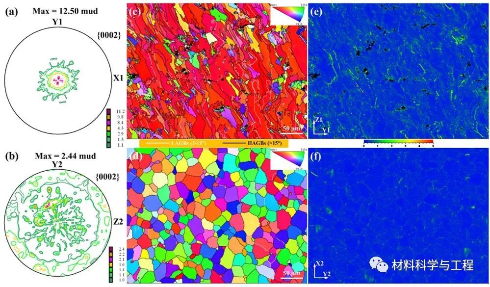 图2 打印态(a, c, e)和半连铸态(b, d, f)G10K合金的XRD宏观织构(a, b)和EBSD表征(c-f)