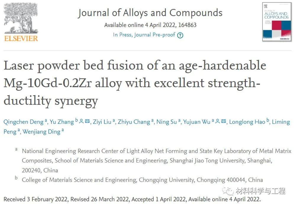上海交通大学材料科学与工程学院轻合金精密成型国家工程研究中心彭立明教授团队以Mg-10Gd-0.2Zr(G10K, wt.%)为研究对象,研究了LPBF过程独特的热历史对打印态G10K合金的显微组织和力学性能的影响,并和半连铸态合金进行对比。打印态G10K合金的屈服强度、抗拉强度和延伸率分别为203 ± 4 MPa,271 ± 4 MPa和10.3 ± 1.1%,而半连铸态合金分别为146 ± 2 MPa,225 ± 5 MPa和7.0 ± 0.1%。上述成果以“Laser powderbed fusion of an age-hardenable Mg-10Gd-0.2Zr alloy with excellent strength-ductility synergy”为题在Journal of Alloys and Compounds期刊上在线发表,博士生邓庆琛为第一作者,吴玉娟研究员和重庆大学张宇副教授为共同通讯作者。