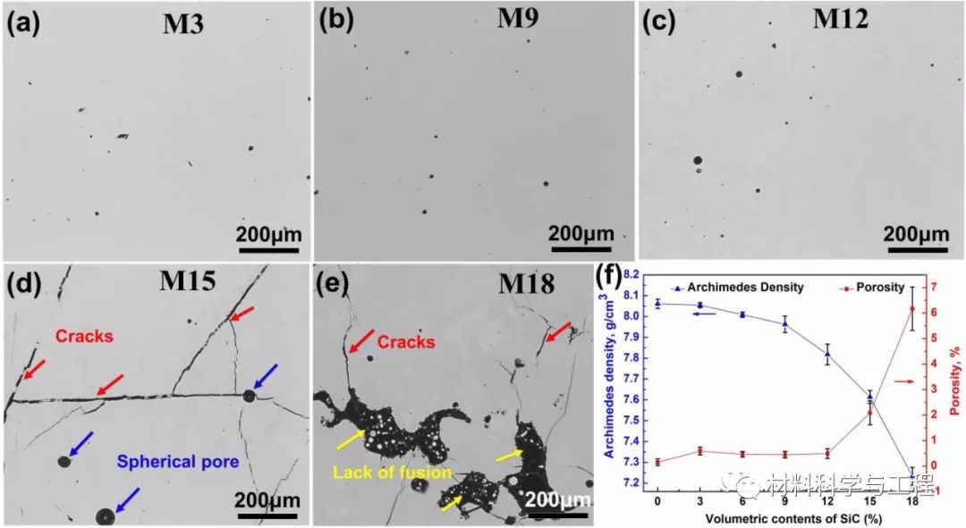 本文通过LPBF制备了含量为3、6、9、12、15、18vol% SiC颗粒增强MS基复合材料。首先,对MS-SiC复合材料的致密度进行了表征,如图1所示。在添加量低于12vol%时,复合材料内部仅存在少量气孔,且孔隙度随SiC颗粒的加入变化不大。然而,当SiC含量达到15和18vol%时,出现了一些裂纹和未熔合等缺陷。这可能是由于高热导率的SiC颗粒在冷却过程中显着增加了熔池的热导率,从而导致残余应力增加。此外,SiC的加入使得复合材料的塑性下降,最终导致了材料内部缺陷的产生。