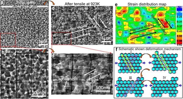 图4 原位SEM观察在650℃拉伸过程中的演变,(a)初始态SEM组织;(b)局部放大显示材料具有蜂窝壳结构;(c)ε=0.4时的SEM组织;(d)局部放大显示相界周围的FIB刻痕发生了偏折;(e)基于FIB刻痕节点位移计算材料内的微观应变分布;(e)相界面滑移对材料的超塑性变形发挥了重要的作用。