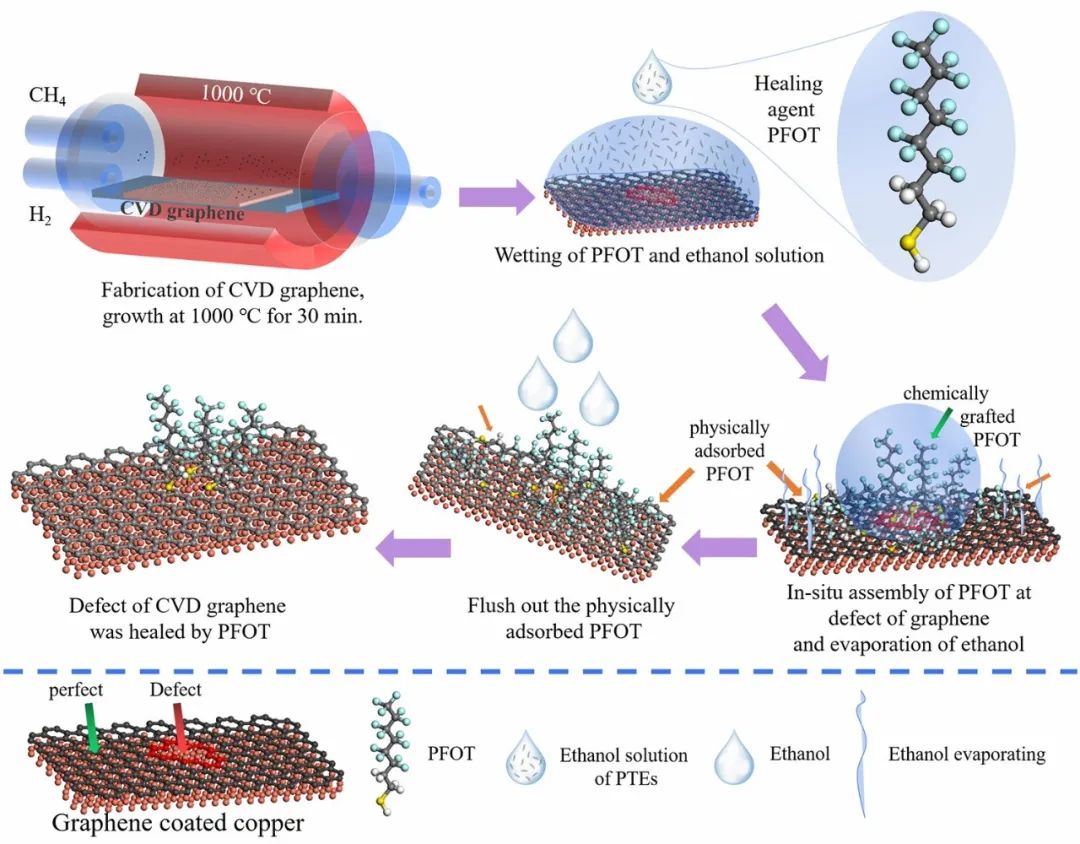 研究人员基于溶液蒸发过程中1H,1H,2H,2H-全氟辛硫醇(PFOT)分子在石墨烯缺陷位置的原位自组装(图1),通过硫醇与缺陷位点暴露的铜基底形成化学键快速修复缺陷。采用原子力显微镜和拉曼光谱联用技术验证PFOT修复石墨烯缺陷的精准度,发现PFOT选择性吸附在不同类型和尺寸的石墨烯缺陷上,在石墨烯完整区域没有出现PFOT分子。