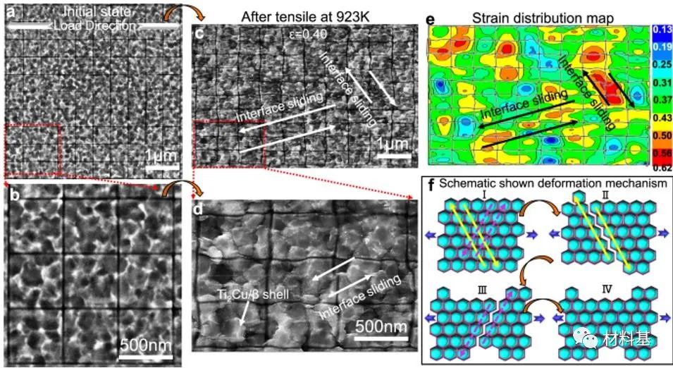 图1 (a)双相蜂窝壳(DPHS)纳米结构;(b)不稳定温度与平均晶粒尺寸。用电沉积严重塑性变形热机械处理表面机械磨损和机械合金化处理的金属的文献数据。误差棒表示测量晶粒尺寸的标准偏差。(c)拉伸强度与伸长率;(d)923K时的应力与应变曲线,展示了Ti6Al4V5Cu合金的超塑性