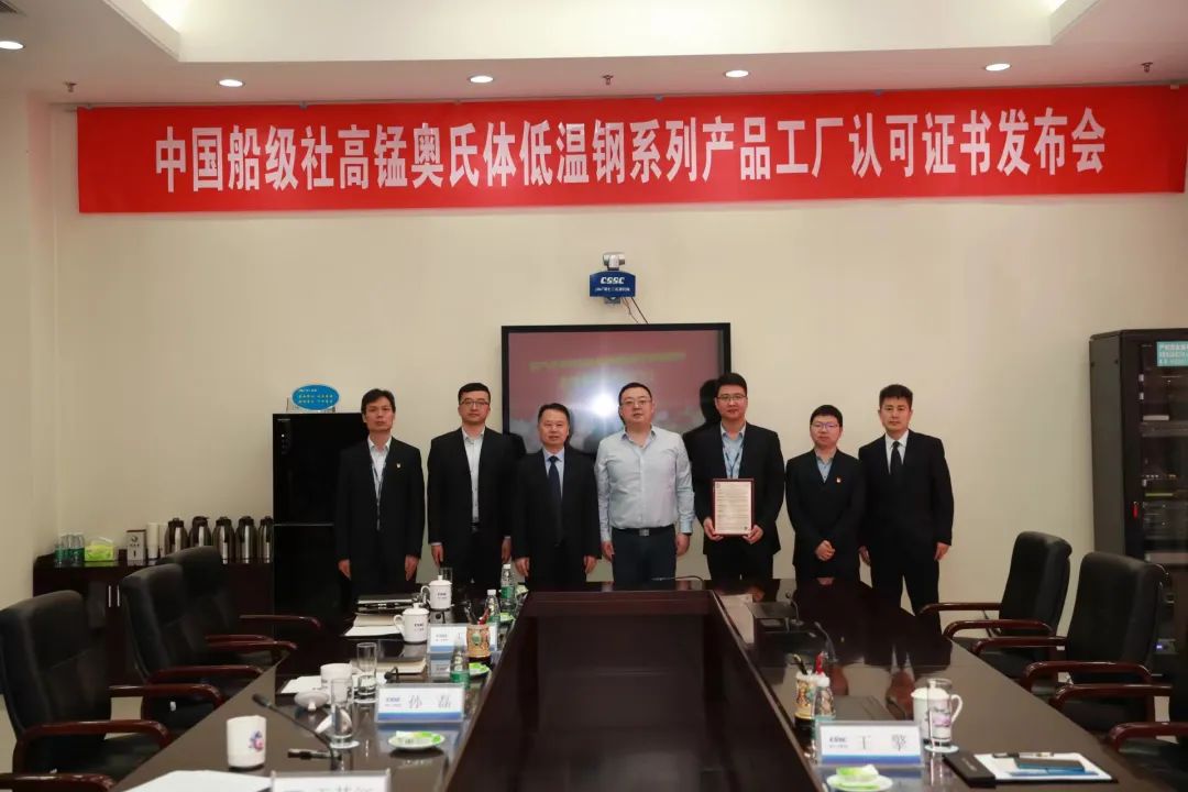 2022年4月22日,中国船级社(CCS)采用线上线下相结合的方式举行了高锰奥氏体低温钢系列产品“云发证”。河北钢铁集团及舞阳钢铁有限责任公司、中船集团725研究所、中集安瑞科、大连船舶重工、江南造船集团等相关领导通过视频参会。此次“云发证”为725所的高锰钢焊接材料、河钢舞钢的高锰钢钢板、中集宏图的高锰钢储罐颁发的工厂认可证书,都是高锰奥氏体低温钢同类产品的国内首张CCS认可证书。标志着国产高锰奥氏体低温钢的研制成功,为国内LNG动力船的材料创新提出了切实可行的解决方案。