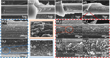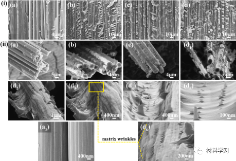 图 10.界面性能测试后复合材料的断裂面:(a)CF,(b)CF-COOH,(c)CF-PEI,(d)CF-PEI-MG在(i)纬向和(ii)暴露的纤维