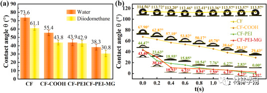 图 6.(a) 不同CF与测试液体之间的接触角。(b) 不同CF束与水滴随时间变化的接触角