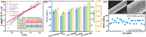 图 7.(a) 威布尔分布拟合曲线及相关参数表,包括威布尔形状参数(m)、尺度参数(δ0(b)商业尺寸CF和不同CF增强复合材料的IFSS,ILSS和弯曲强度。(c) CF-MOF的扫描电镜图像和相应复合材料的IFSS