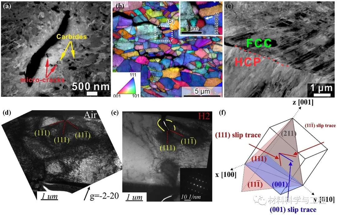 图7 高熵合金的氢致裂纹萌生与扩展。(a)基体/碳化物界面;(b)晶界;(c)FCC/HCP两相界面;(d-f)氢致开裂沿着两个{111}面的交面,即(001)面。