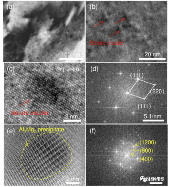 图11所示为所制备的 Al-13Mg 合金的显微组织:(a) TEM 照片;(b) 相应的化学分布图;(c) 溶质簇的 HRTEM 图像;(d) (c)对应的FFT图像;(e) Al3Mg2 相;(f) IFFT 图像和插图是 (e) 中红框的 FFT 图像。