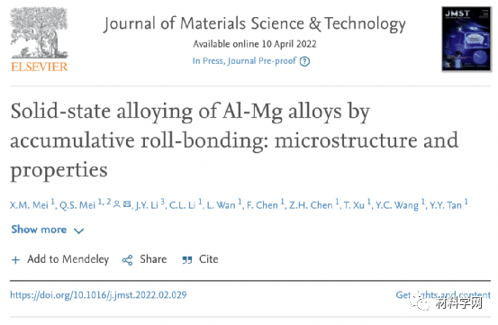 在我们之前的研究中,具有超高 N(高达 300)的 ARB 已在纯金属和金属基纳米复合材料中成功进行运行。本研究中,武汉大学Q.S. Mei团队采用超高N的 ARB固态合金化来制备Al-Mg合金,并对Al-Mg合金的显微组织进行表征,以检验其合金化效果。研究人员对Al-Mg合金进行了力学性能和腐蚀性能试验,表明了这些合金的优异性能,同时讨论了其微观结构与性能的关系。相关研究相关研究成果以题“Solid-state alloying of Al-Mg alloys by accumulative roll-bonding: microstructure and properties”发表在《Journal of Materials Science & Technology》上。