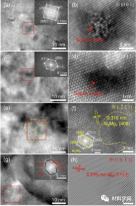 图7所示为Al-13Mg中间体样品显微组织:(a) (c) HRTEM图像显示合金不同区域形成的溶质团簇,插图为相应的FFT红框图像;(b)(d)分别为(a) (c)内红框标记区域对应的放大图像;(e) Al3Mg2相的HRTEM图像,黄色虚线表示Al3Mg2相的形状;(f) (e)中红框标记区域对应的放大图像;(g)显示纯Mg存在的HRTEM图像,嵌入红框对应的FFT图像;(h) (g)中红框标记区域对应的放大图像。