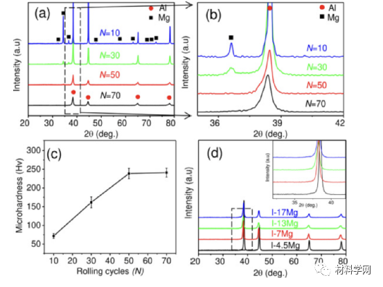 图4所示为(a) 不同N含量的Al-17Mg中间样品的XRD图谱;(b) 为(a) 中放大的 XRD 图案;(c) 不同N含量的Al-17Mg中间样品的显微硬度;(d) 具有不同 CMg 的 Al-Mg 中间样品的 XRD 图谱,插图是 (d) 中放大的 XRD 图谱。
