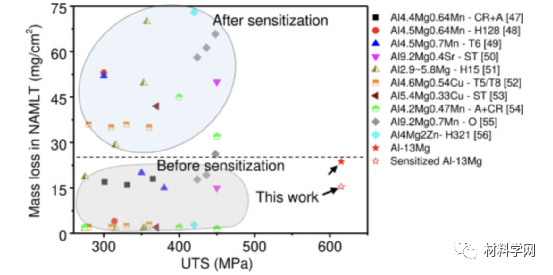 图14所示为UTS 与不同 Al-Mg 合金在 NAMLT 中的质量损失关系。CR:冷轧;A:退火;ST:固溶处理;H128、T6、H15、T5、T8、H321、O:不同热处理状态。图中虚线为易受IGC影响的分界线。