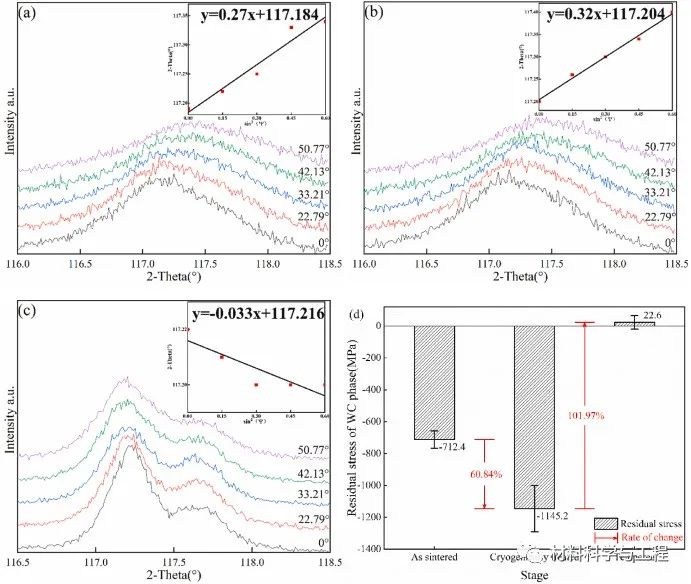深冷处理后,由sin2 (ψ ) - 2θ X射线衍射法计算的WC相平均压缩残余应力增加了60.84%。回火处理使残余应力得到缓解,甚至使压应力转变为拉应力,变化可达101.97%。