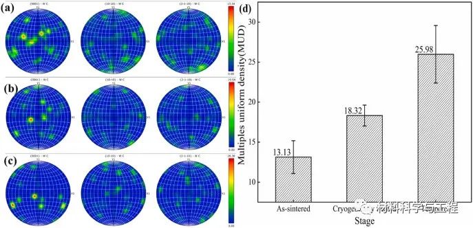 图4烧结态(a )、深冷处理态(b )、回火态(c )硬质合金WC相的极图和MUD值(d )