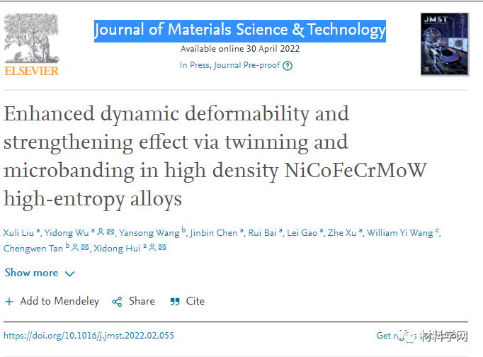 在这项工作中,北京科技大学惠希东教授团队采用 HEA 的概念开发了一种新型 NiCoFeCrMoW 材料。难熔元素Mo和W用于提高机械性能、密度、熔点和其他物理性能。通过热机械加工和微观结构控制,优化了这些 HEA 的室温拉伸和动态压缩性能。探讨了压缩和变形行为的应变率敏感性。这些 HEA 具有出色的准静态拉伸和动态压缩性能,例如 Ni 30 Co 30 Fe 21 Cr 10 W 9在准静态试验中,在 1573 K 退火的 HEA 的屈服强度和极限抗拉强度和伸长率分别为 ?364 MPa、?866 MPa 和 ?32%;屈服强度约为 710 MPa,在 4100 s -1的动态应变速率下没有断裂. 已证明屈服强度优于先前报道的 FCC HEA 的应变率敏感性 (SRS)。相关研究成果以题“Enhanced dynamic deformability and strengthening effect via twinning and microbanding in high density NiCoFeCrMoW high-entropy alloys”发表在国际著名期刊Journal of Materials Science & Technology上。