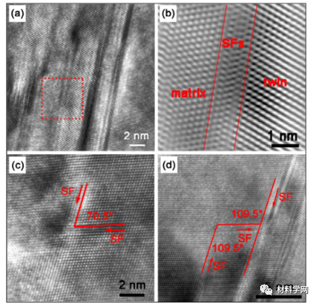 图 10. 动态(~4500 s -1)变形后 Mo4W3 HEA 中的 HRTEM 图像。(a) 结对结构;(b) (a)中矩形区域的放大图;(c) 锐角为 70.5° 的 V 形 SF 构型;( d )T形和V形的混合型SF配置,角度为109.5°。