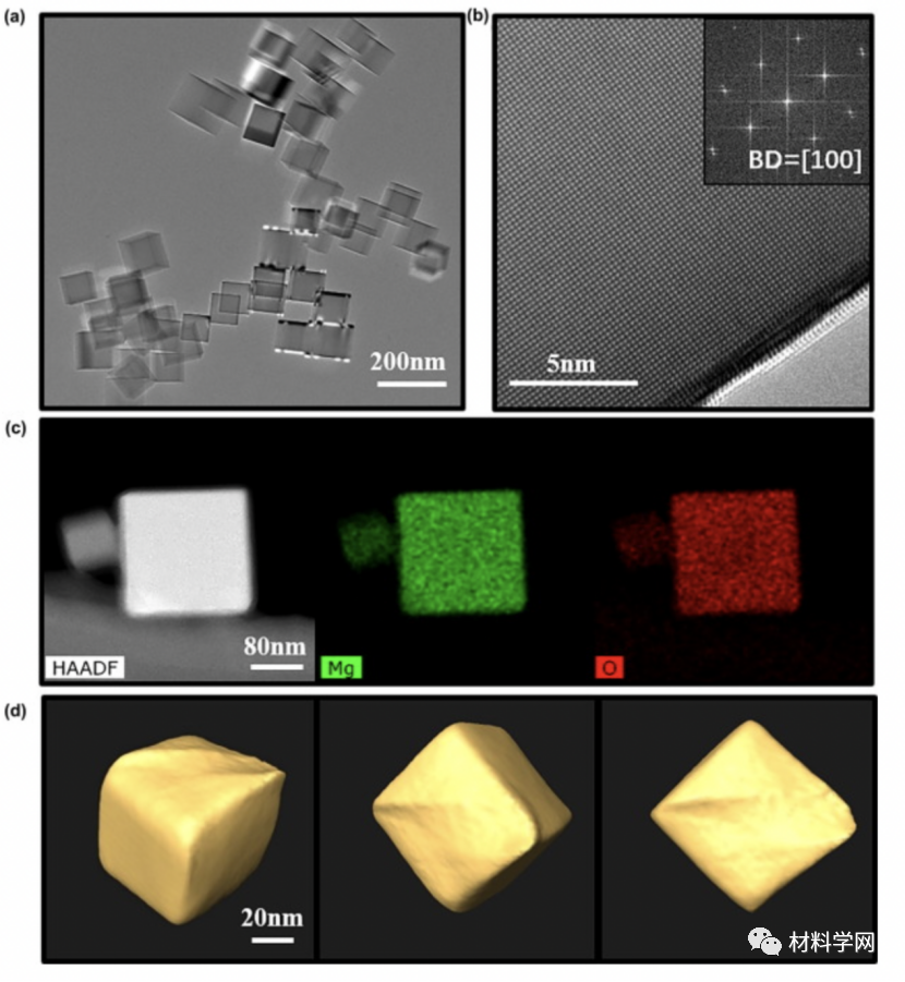 图1所示:MgO 纳米颗粒的结构和形态表征。(a) 聚集的 MgO 纳米粒子的 TEM 明场图像。(b) 典型 MgO 纳米颗粒的 HRTEM 图像和沿 [100] 光束方向的相应快速傅里叶变换 (FFT) 图案。(c) MgO 纳米粒子的 STEM-HAADF 图像和 EDS 映射。(d) MgO 纳米粒子的 3D 断层扫描。