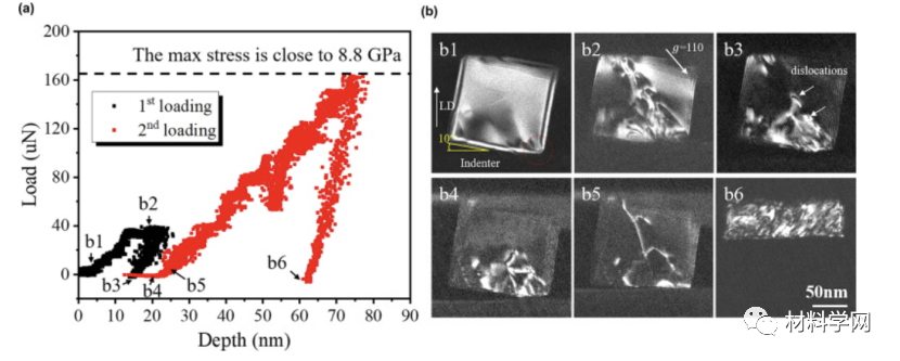 图 5所示:在原位压缩试验中,当预先引入位错时,MgO NP 强度和连续变形能力较低。(a) 载荷深度曲线。(b) 从影像5和负载后变形的 NP (b6) 捕获的时间序列 TEM 图像 (b1-b5),显示了 MgO NP 的变形行为。MgO NP 的尺寸接近 136 nm。首先通过压缩 MgO NP 的一个角(红色循环的位置)引入位错。再次压缩 NP 以研究 MgO NP 与这些预先引入的位错的变形行为。