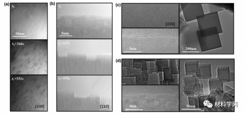 图2所示:电子束对MgO纳米粒子的影响。(a-b)电子辐照下MgO纳米颗粒表面纳米化的TEM时序图像。(c) HRTEM图(左)和TEM明场图(右)显示了电子辐照后大于100 nm的MgO纳米颗粒的形貌。d HRTEM图(左)和TEM明场图(右)显示了电子辐照后小于100 nm的MgO纳米颗粒的形貌。