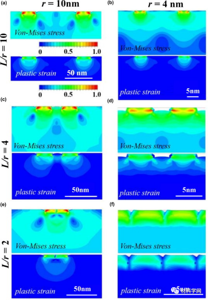 图6所示:不同表面凸块尺寸 (r) 和密度 (L/r) 的 MgO 模型样品的计算降低 Von-Mises 应力和塑性应变分布。