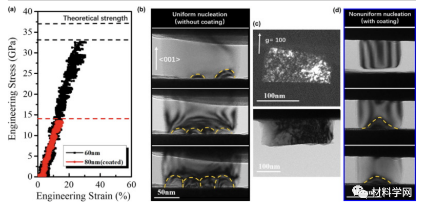 图4所示:在透射电镜中对小于100 nm的MgO纳米颗粒进行原位压缩试验。(a) 60 nm(无涂层)和80 nm(有涂层)MgO纳米颗粒的应力-应变曲线。(b)从影像4捕获的TEM图像,显示了小于100 nm的MgO纳米颗粒表面的位错均匀形核。(c)压缩试验后不同尺寸NPs的暗场和明场TEM图像,显示这些NPs内部产生了大量位错。(d)透射电镜(TEM)图像显示了在一个包覆碳的80 nmMgO纳米颗粒表面的位错异相形核。