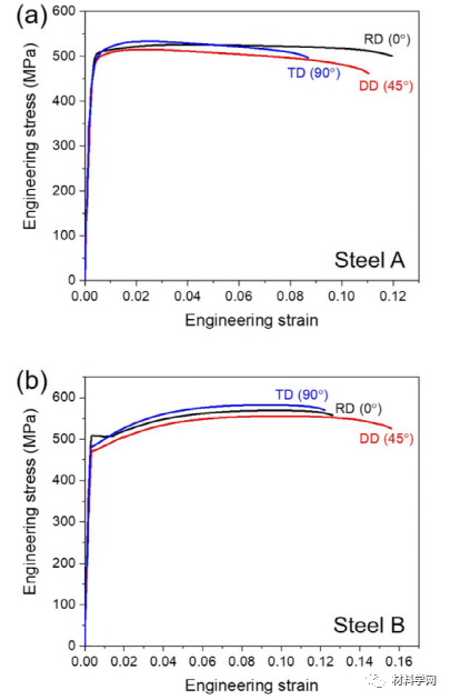 图 2。原样 (a) 钢 A 和 (b) 钢 B 的单轴拉伸应力-应变曲线,加载轴平行于板材的 RD、DD 和 TD。