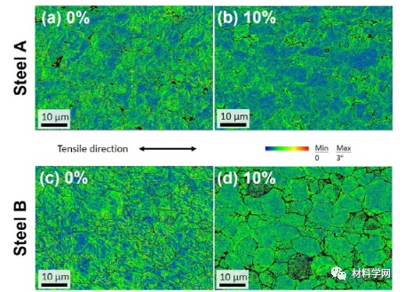 图 5。目前两种钢(a,c)在应变至 10%(沿 RD)之前和(b,d)之后的 EBSD-KAM 映射。