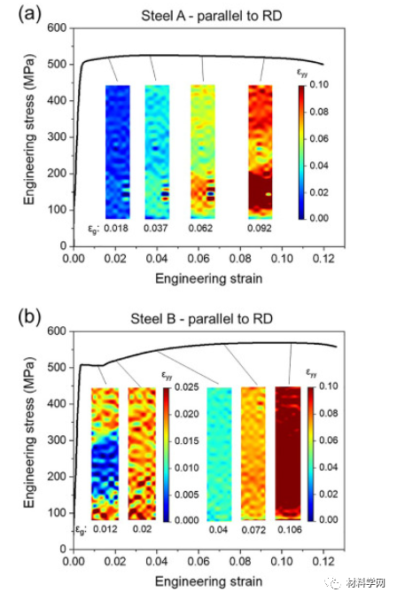 图 1。原样 (a) 钢 A 和 (b) 钢 B 的单轴拉伸应力-应变曲线,加载轴平行于板材的 RD。还显示了每个测试(视场:25 mm × 4.7 mm)在各种全局工程应变 ( εg )下轴向应变场 ( εyy )的相应演变。