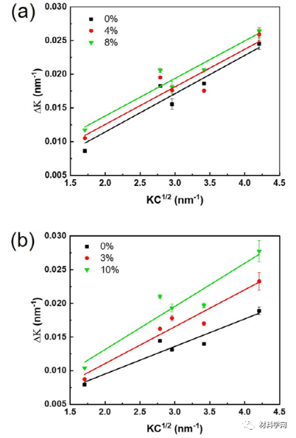 图 8。根据等式 (5) ,在各种工程应变下 (a) 钢 A 和 (b) 钢 B 的修正 Williamson-Hall 图。