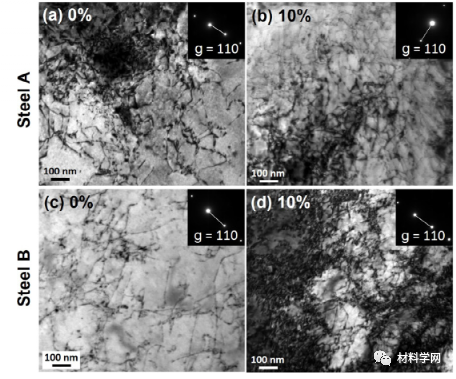 图 6。明场TEM图像,在(110)双光束条件下,显示了当前两种钢(a,c)在应变至 10%(沿 RD)之前和(b,d)中大晶粒的位错结构。
