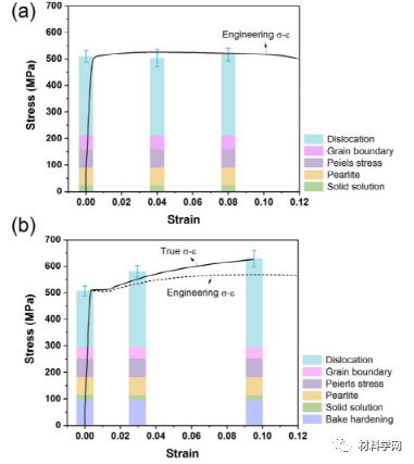 图 11。(a) 钢 A 和 (b) 钢 B塑性变形过程中各自的强化对流变应力的贡献。对于均匀伸长率非常小的钢 A,只显示了工程应力-应变曲线,并绘制了硬化贡献对抗工程压力。对于钢 B,工程和真实应力-应变曲线都显示出来,硬化贡献相对于真实应变作图。实验确定的真实应力与计算的真实应力很好地匹配。