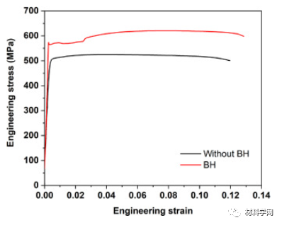 图 10。经烘烤硬化 (BH) 处理和未经烘烤硬化 (BH) 处理的钢 A 样品的单轴拉伸应力-应变曲线(平行于 RD 的加载轴)。