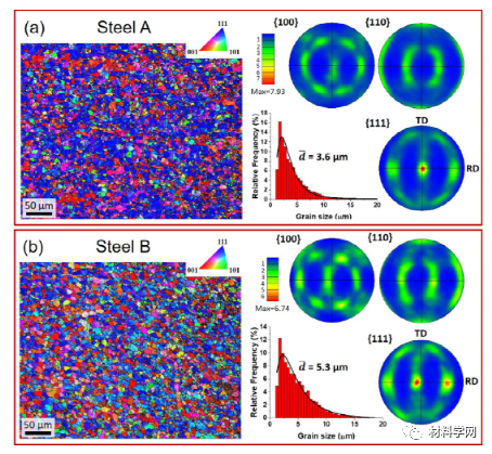 图 4。收到的 (a) 钢 A 和 (b) 钢 B 的反极图 (IPF) 电子背散射衍射 (EBSD) 图。还提供了基于 EBSD 图的极图和晶粒尺寸分布。