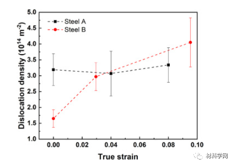 图 9。目前两种钢的位错密度随真应变的演变,由修正的 Williamson-Hall 图确定。