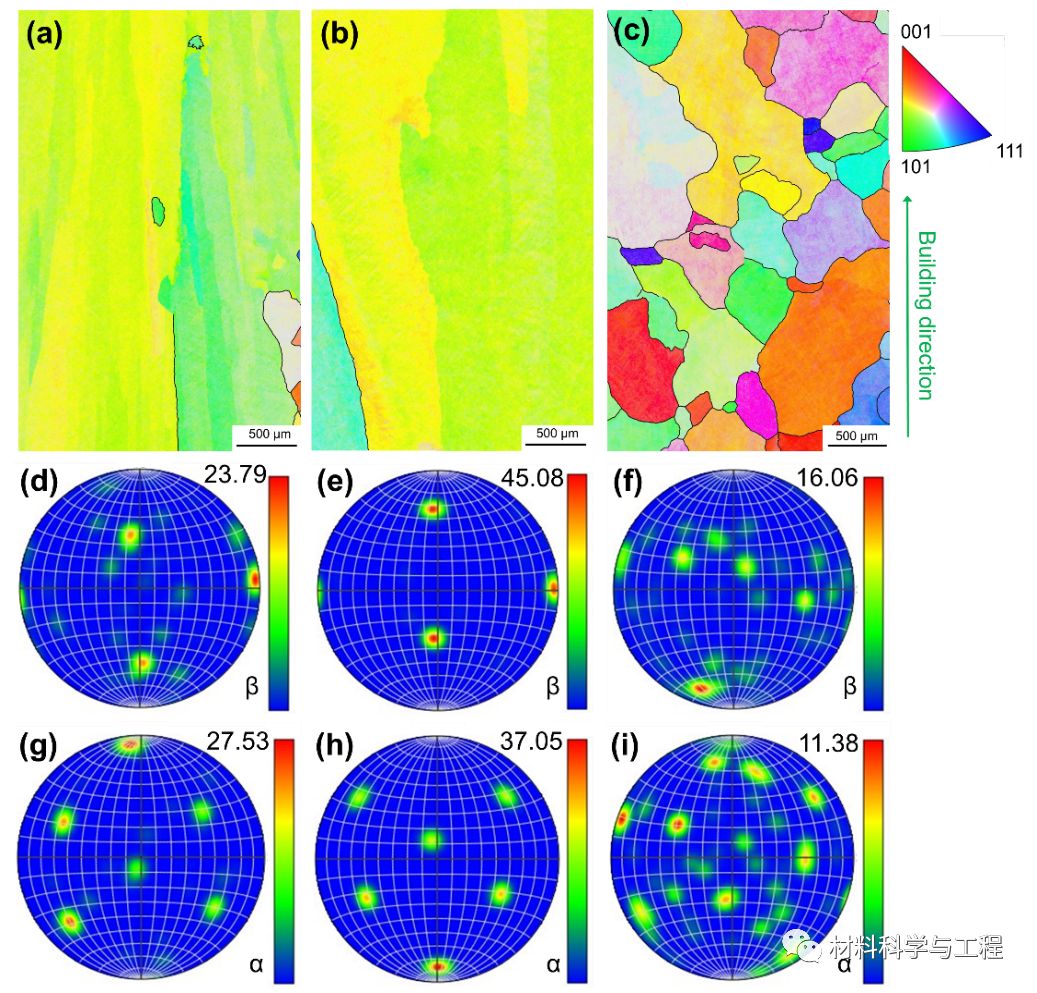 从宏观晶粒形貌光镜图和EBSD图中可以看到,通过交替使用两套不同的成形工艺参数,宏观晶粒形貌由任何一个单一参数时的粗大柱状晶,转变为交替参数时的等轴晶。进一步的α相和β相极图分析表明,所获得的全等轴晶结构织构强度明显降低,在三个不同平面上具有相近的织构指数。