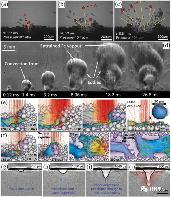 图7:显示不同时刻粉末运动的动态 X 射线图像(a)-(c),显示金属蒸气气体在不同时刻运动的纹影高速图像 (d),模拟熔池动力学由于飞溅物的激光喷射 (e) 和飞溅物与熔池之间的正面碰撞 (f),超高速 X 射线成像揭示了高能量密度下的小孔凹陷和不稳定性(g)-(j) . 这些数字经 Elsevier、Springer Nature 和 AAAS 许可转载