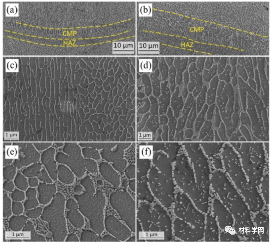 图5:搭建平台温度对LPBF AlSi10Mg组织的影响。35℃时熔池边界(a)、富硅网络(c)和纳米颗粒(e), 200℃时熔池边界(b)、富硅网络(d)和纳米颗粒(f)。图经Elsevier许可转载。