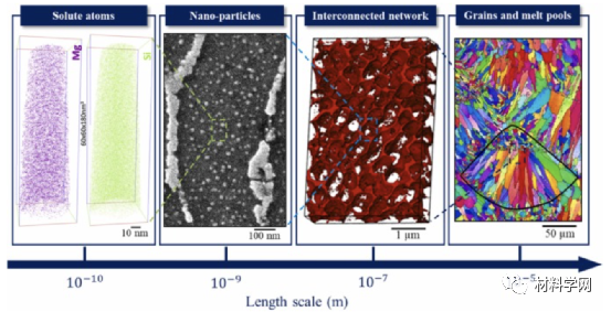 图2:LPBF AlSi10Mg 微观结构的跨尺度方面,从埃大小的溶质原子、纳米颗粒和亚微米厚的胞状网络,到微米大小的晶粒和熔池。
