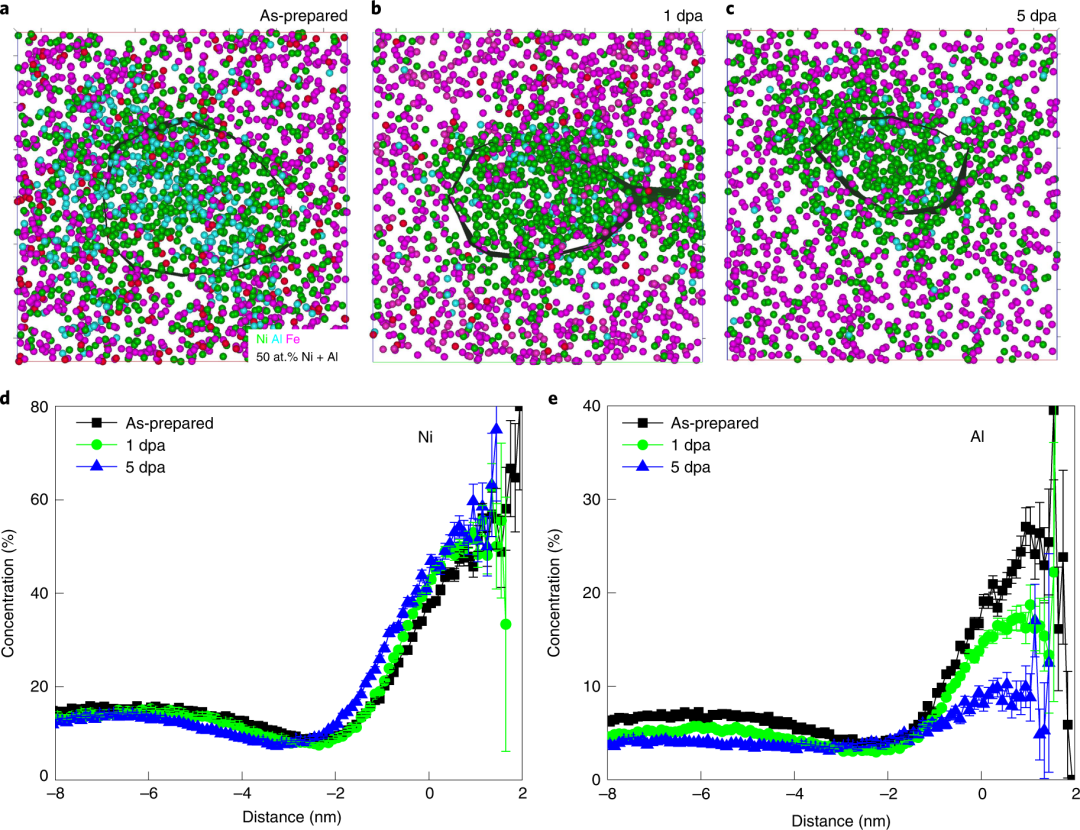 图3 超晶格钢中NPs的辐照诱导溶解机理;a-c,来自APT数据集的亚体积(7 nm × 7 nm × 1 nm),显示了室温下离子辐照前后NPs的成分演变。d,e,近距离直方图显示了离子辐照前后NPs中Ni (d)和Al (e)的成分分布。误差条是均值的标准偏差。