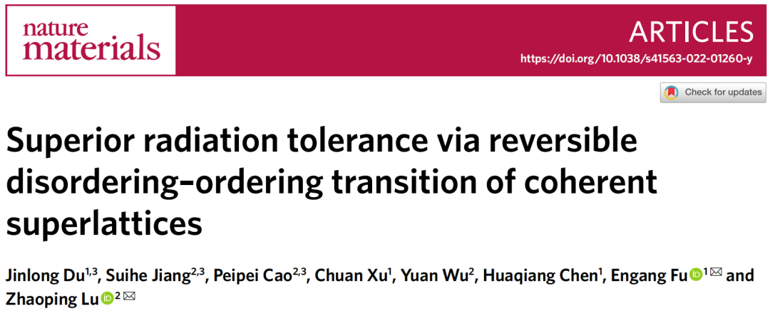 近日,北京大学付恩刚教授团队,北京科技大学吕昭平教授团队强强合作,报道了一种与常理相反的策略,利用纳米低错配共格沉淀马氏体时效钢,发明了一种新的耐辐照机制,大幅度提高了合金的抗辐照能力。本工作首先在马氏体时效钢中引入的超晶格纳米沉淀物,这种结构的殊胜之处是在纳米沉淀物附近可诱导结构可逆的局部无序-有序转变。研究表明:在含有高密度B2有序超晶格的马氏体钢中,即使在400-600°C的超高剂量辐照损伤后,也没有检测到空洞膨胀。在高度饱和的基体中,低错配超晶格的重新有序过程发生在快速的无序化之后。这样,通过辐照诱发的点缺陷和过剩溶质的会发生短程重新有序。这一动态过程稳定了微观结构,不断促进原位缺陷复合,并有效地阻止了长程扩散过程。从而大幅度提高了材料的耐辐照性能。该策略可应用于其他材料,为开发高耐辐照材料铺平了道路。相关成果以“Superior radiation tolerance via reversible disordering–ordering transition of coherent superlattices”为题发表在材料学顶级期刊《Nature Materials》上。