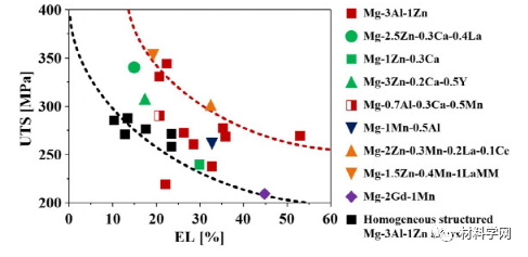 图 4。多峰/双峰晶粒高合金镁合金与均质结构高合金镁合金的机械性能比较。两条虚线显示强度和延展性之间的权衡关系(香蕉曲线)。