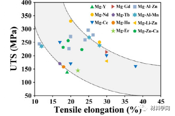 图 1。UTS与 Mg-RE 和无 RE 合金的伸长率之间的关系,包括 Mg-Y [25]、Mg-Nd [ 28、29 ] 、Mg-Ce [ 17、30 ] 、Mg -Gd [31] 、 Mg- Tb [55] , Mg-Ho [55] , Mg-Er [55] , Mg-Al-Zn [56] , [57] , [58] , Mg-Al-Mn [ 56 , 57 , 59 ], Mg -Li-Zn [60]和 Mg-Zn-Ca [ 13 , 61] 系统合金。两条虚线显示强度和延展性之间的权衡关系(香蕉曲线)。
