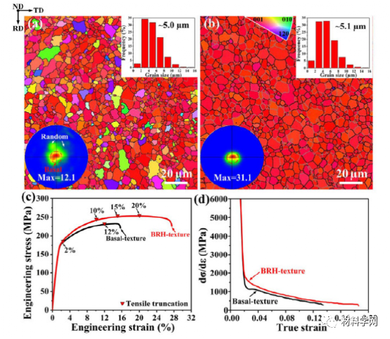 图 2。(a) BRH-texture 和 (b) basal-texture Mg-1Zn-1Sn-0.3Y-0.2Ca (ZTWX1100) 样品的EBSD反极图 (IPF) 图、粒度分布和相应的 (0002) 极图。(c) 相应的拉伸工程应力-应变曲线在 RT,和 (d) 应变硬化率与 (c) 的真实应变。RD、TD 和 ND 分别代表滚动、横向和法线方向。