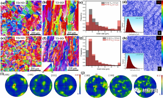 图 6.EBSD分析显示HEA(a-d)和HEC(e-h)样品的晶粒取向,晶粒尺寸分布和几何必要位错(GND):分别显示HEA和HEC样品TD-ND平面的逆极点图(IPF),(b)和(f)HEA和HEC样品的横向方向构建方向(TD-BD)平面的IPF图,分别是HEA和HEC样品的TD-ND和TD-BD平面的晶粒尺寸分布, 分别是HEA和HEC样品TD-ND平面的(d)和(h)GND分布,分别是HEA和HEC样品TD-ND平面的(i)和(j)极点图(PF),以及HEA和HEC样品TD-BD平面上沿<001>,<101>和<111>晶体方向的微观纹理强度。